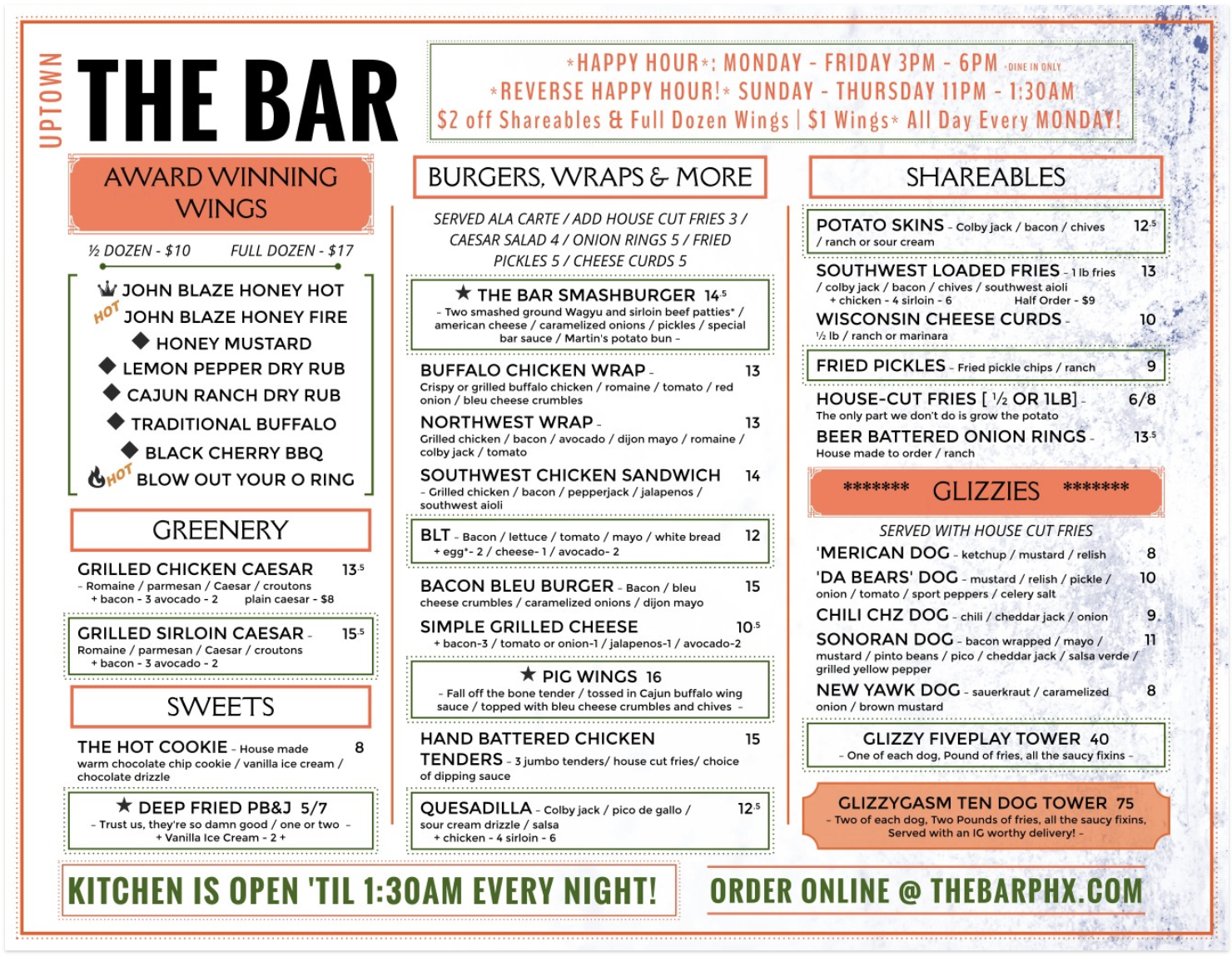 Our Uptown and North Phoenix locations are the ultimate destinations for bold flavors and high-energy dining. While we still serve up our legendary award-winning wings, these spots feature an exclusive "Glizzies" menu and the crowd-favorite Bar Smashburger that you won't find at just any neighborhood pub. Whether you're here for the "Reverse Happy Hour" or a massive food challenge with friends, we bring a unique edge to the Phoenix food scene.